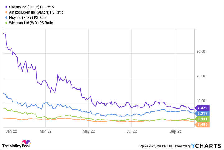 After falling more than 80% from its peak, Shopify stock is still trading at 7.4 times sales. This valuation compares favorably to its five-year average of 30, but that's not the whole story.