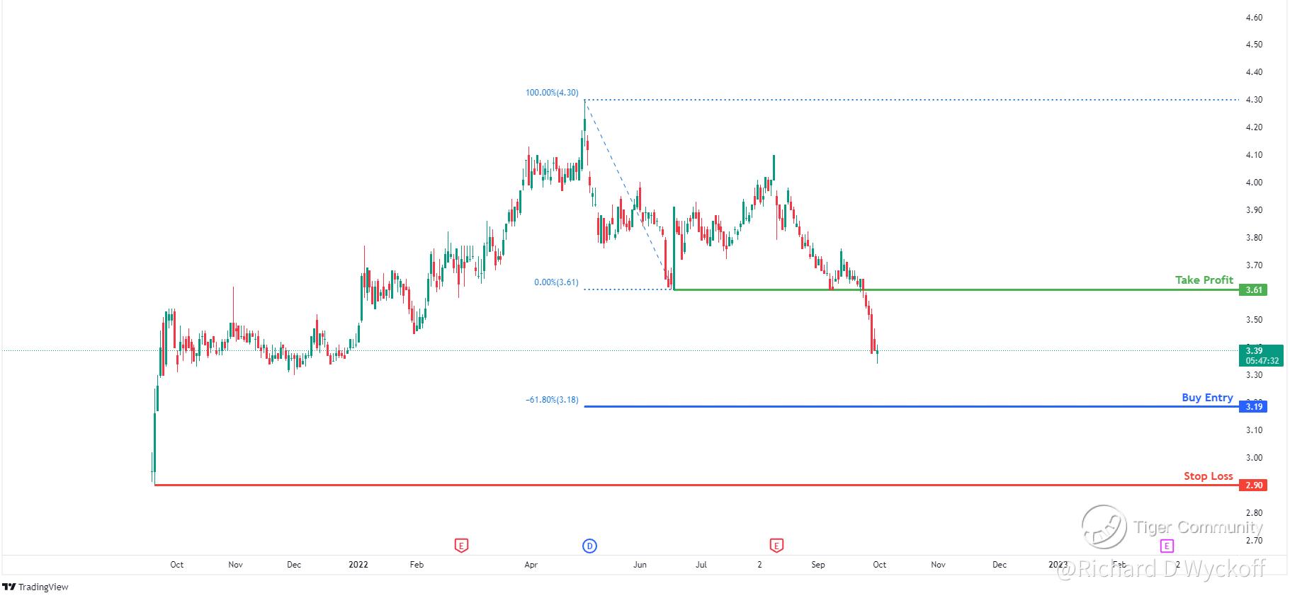 2.) The price is about to test a key support area at 3.30, where it has rejected multiple times since 2021.