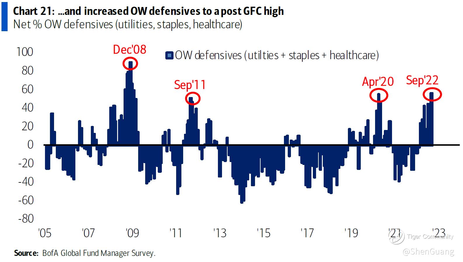 In terms of stock holdings, however, survey respondents indicate that they're increasing their holdings in "defensives", i.e. utilities, staples and healthcare stocks.