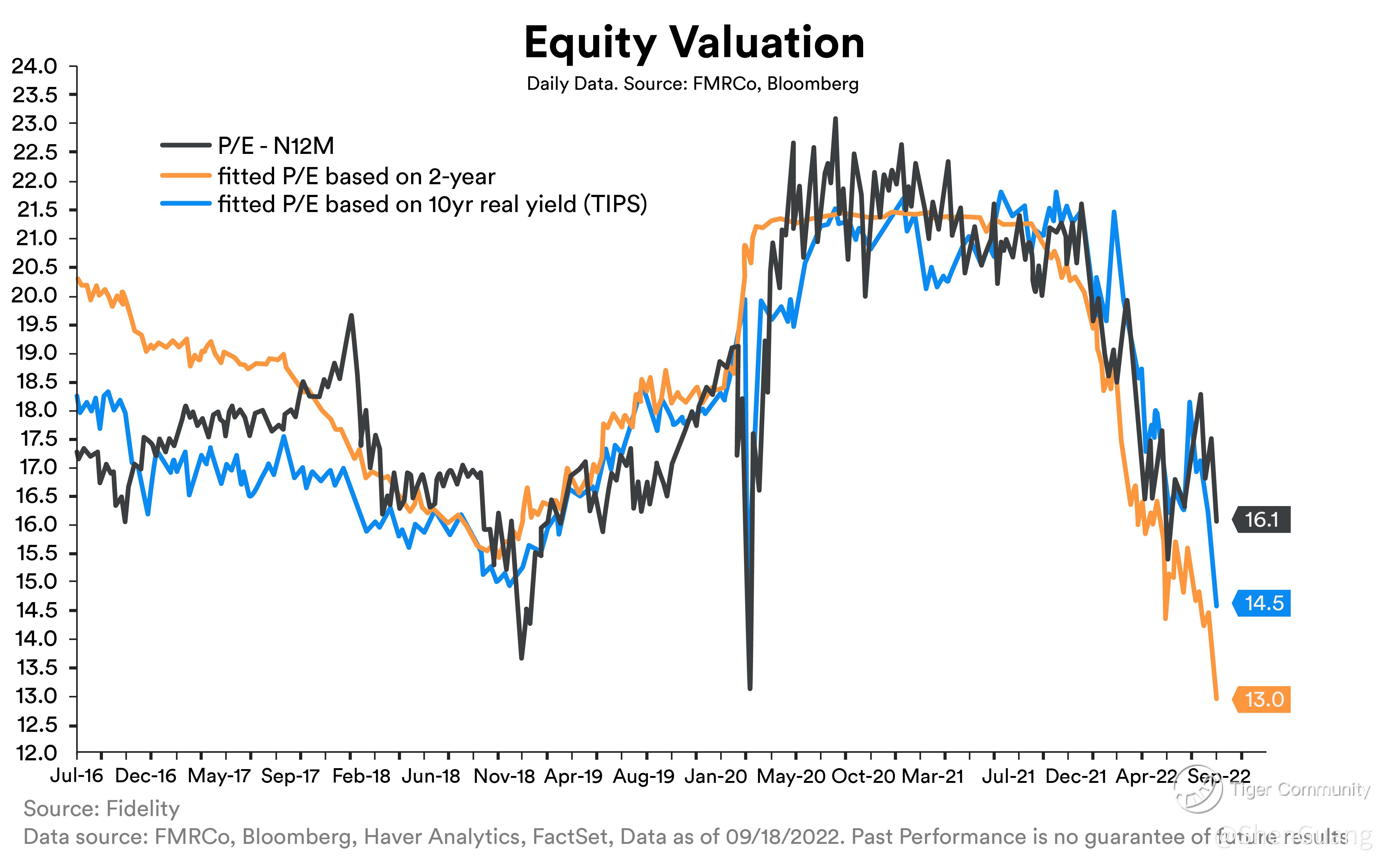 Last week, Mr. Jurrien Timmer, Director of Global Macro at Fidelity Management Research (FMR), made an interesting estimation: after the FOMC update was delivered, the forward-looking fair value for the S&P 500 - which underpins the ($SPDR S&P 500 ETF Trust(SPY)$) - dropped to 14X Forward Earnings Per Share (EPS) that day, which was 15% below that day's level. If earnings growth ends up being flat (at $219) instead of growing +10%, fair value declines by 36%.