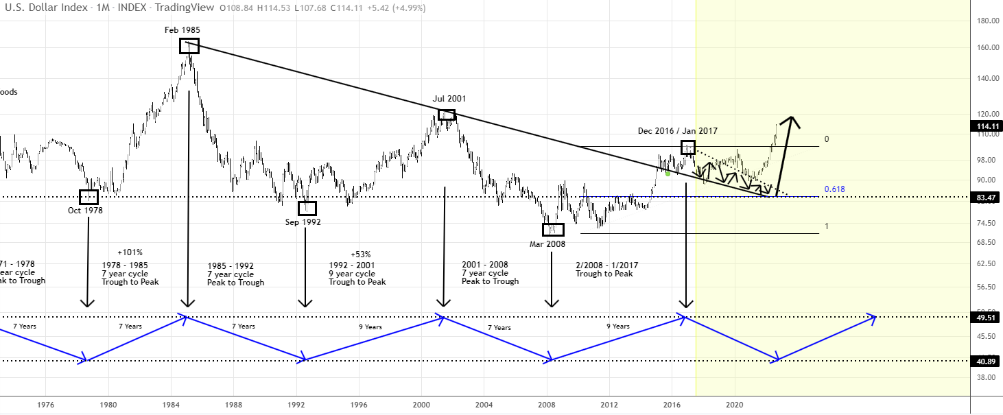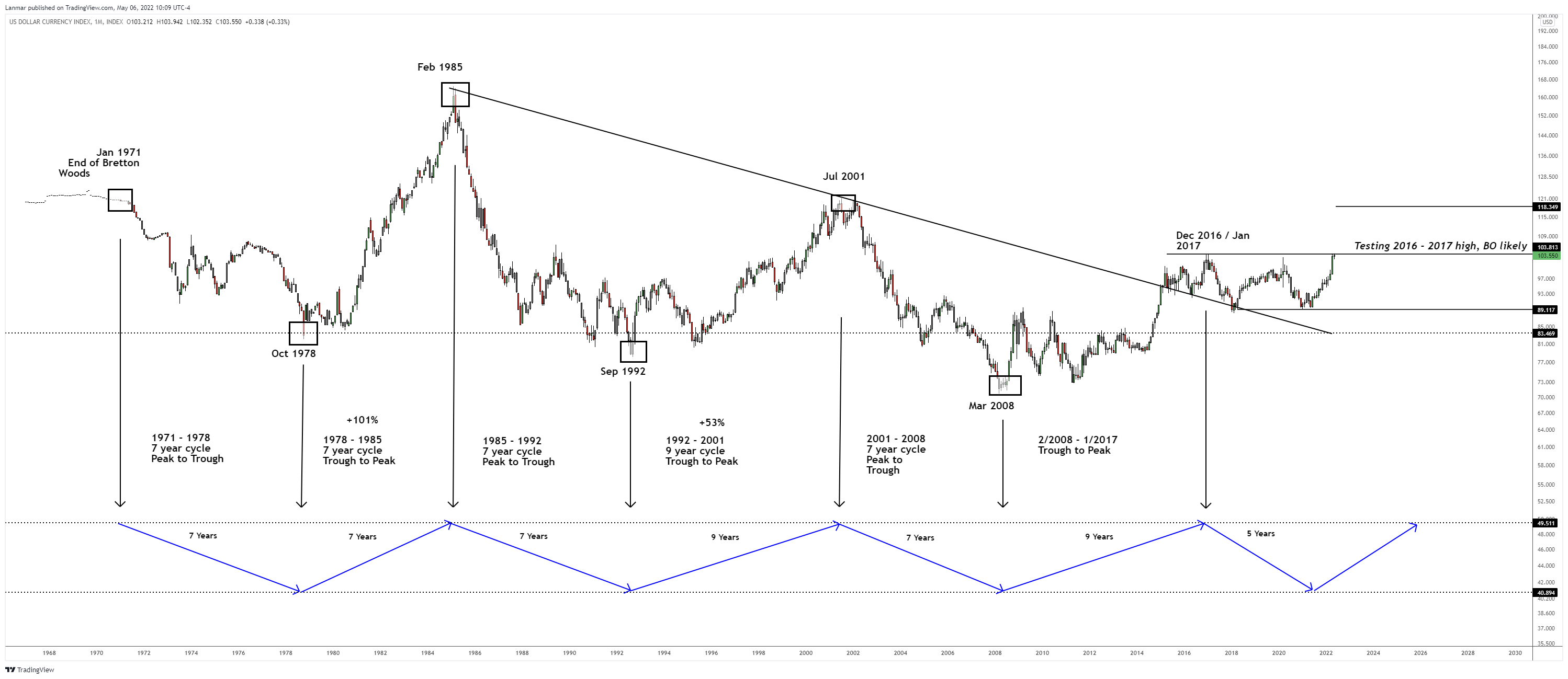 May 6, about 5 years later the USD is retesting the 2017 high. I thought it would take longer than this based on the cycles and structure, but here we are. Measured target of this breakout is around 118. 1618 fib extension is 113 which is also next major resistance. Would not surprise me to see 145 eventually but step by step..https://www.tradingview.com/chart/DXY/NQ1M4L56-US-Dollar-Index-Long-Term-Cyclical-Forecast-Possibility/