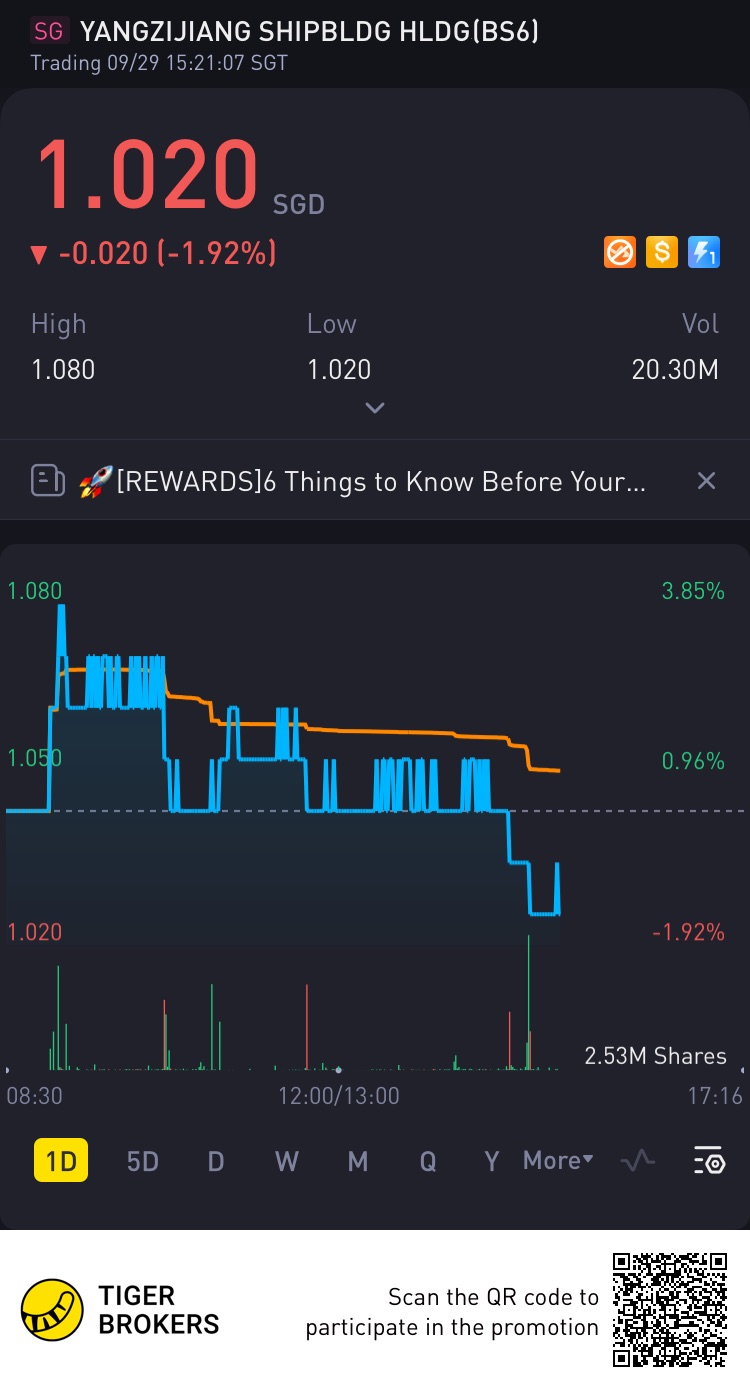 $YANGZIJIANG SHIPBLDG HLDGS LTD(BS6.SI)$CFD Trading – Buy YZJ SHIPBLDG SGD (BS6.SGX) @ $1.00. Stop @ $0.93 and Target @ $1.26