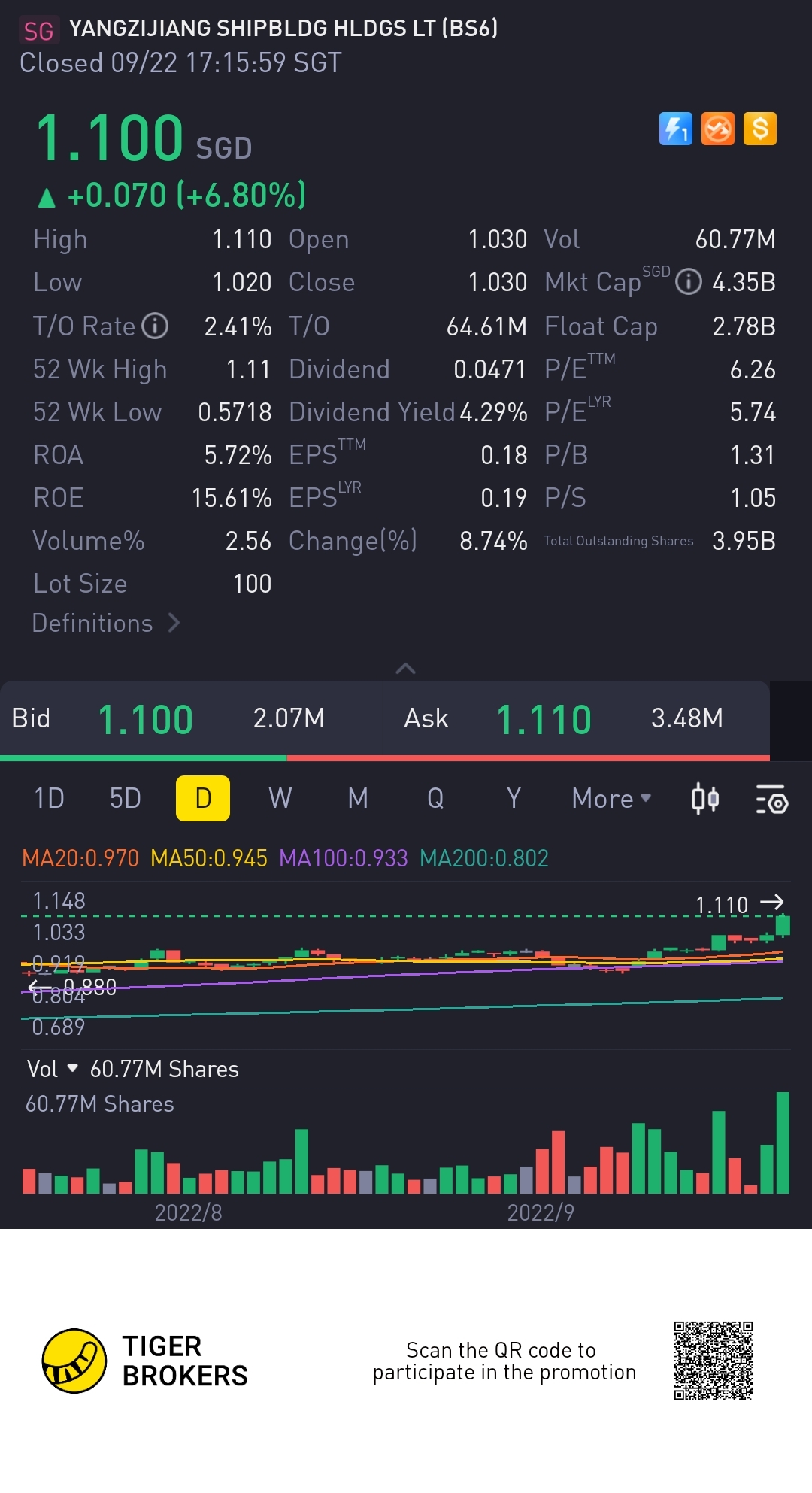 $YANGZIJIANG SHIPBLDG HLDGS LTD(BS6.SI)$Good close and good volume. Tempted due to its potential