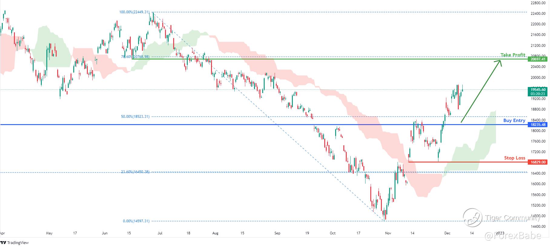 3.) I am waiting to take profit at 20696.83, which is where the 78.6% Fibonacci line is located.