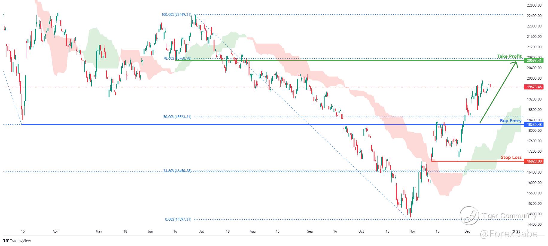 1.) Looking at the H4 chart, I have a bullish bias for HSI with price above the Ichimoku cloud. I have already entered a buy entry at 18235.48, where the previous swing low and 50% Fibonacci line are located.
