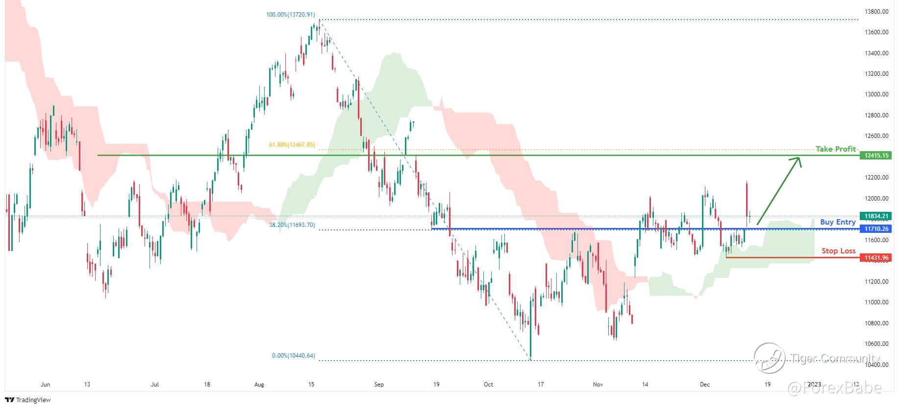 1.) Looking at the H4 chart with price above the Ichimoku cloud it indicates a bullish market, I am looking for a buy entry at 11710.26, where the 38.2% Fibonacci line is.