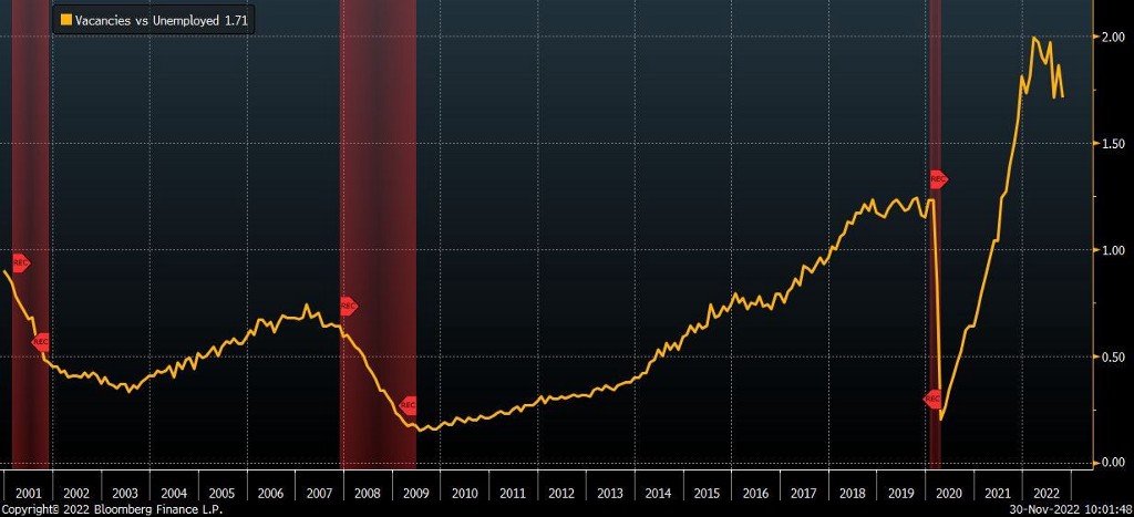 Thus Powell’s popular measure: The vacancies/Unemployed ratio, is still elevated at 1.71, suggesting multiple job opportunities available for the unemployed.