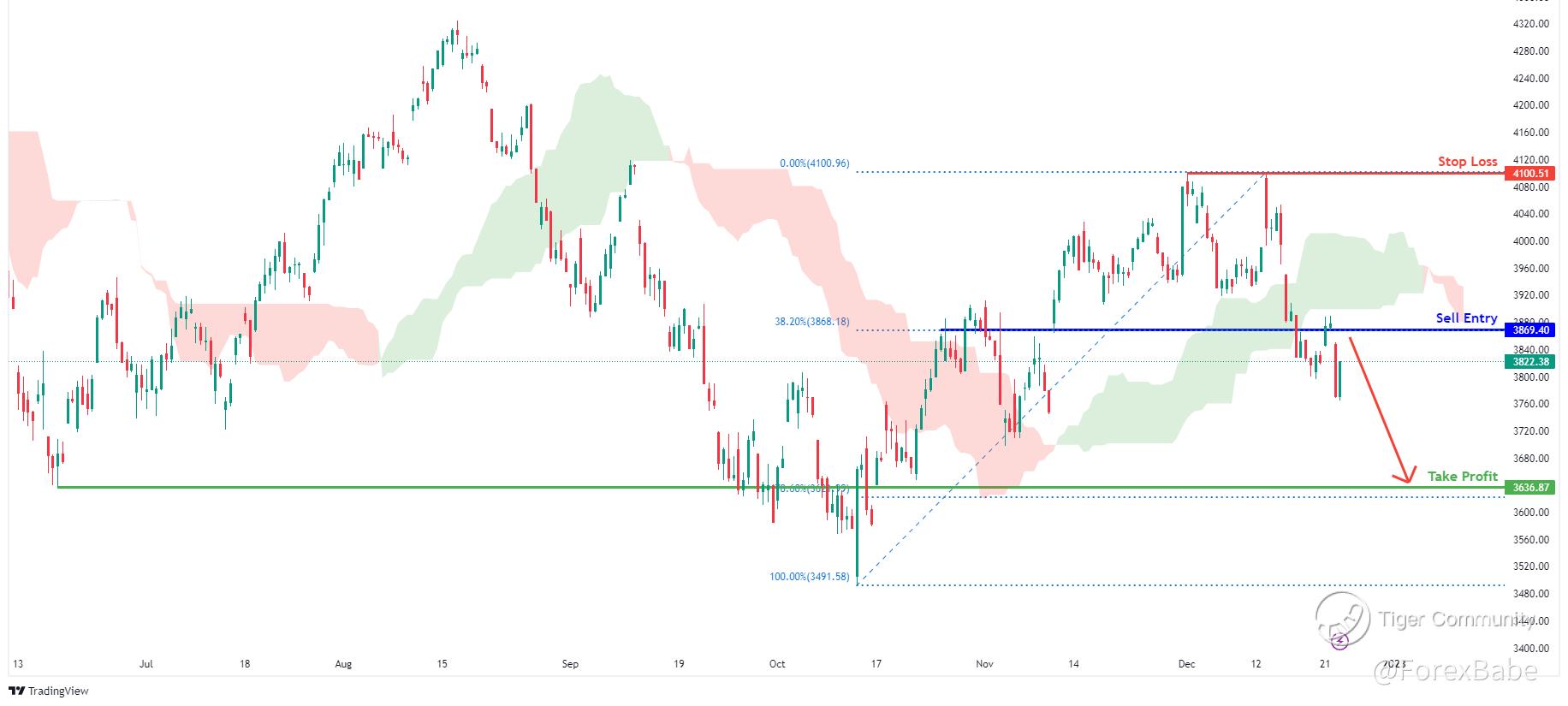 2.) Price has tapped into my sell entry at 3869.40 where the 38.2% Fibonacci line is.