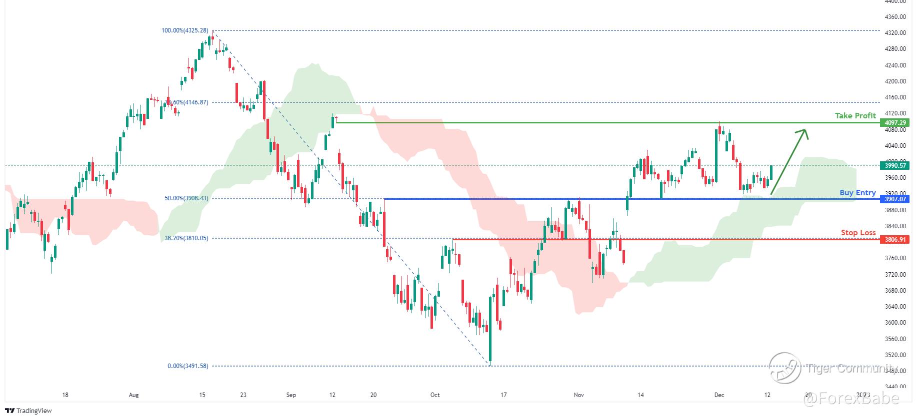 2.) Looking for a potential buy entry at 3907.07, where the 50% Fibonacci line is.