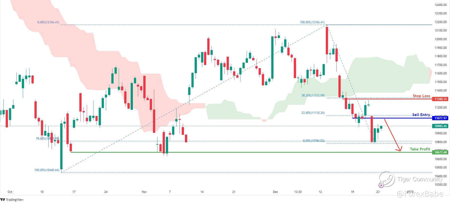 1.) Looking at the H4 chart with price being below the Ichimoku cloud it indicates a bearish market, I am looking for a sell entry at 11077.97, where the 23.6% Fibonacci line is.
