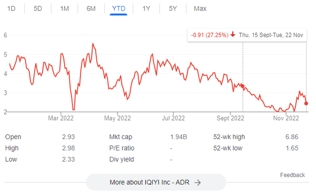 IQ’s share price has declined by 27.25% since my initial post, which is obviously not the result I was looking for, but it is not out of my expectations given the uncertainties in China.