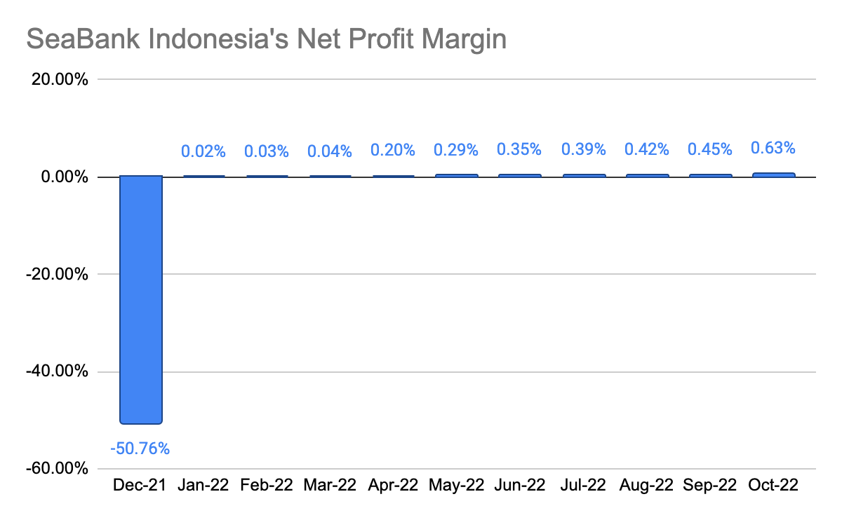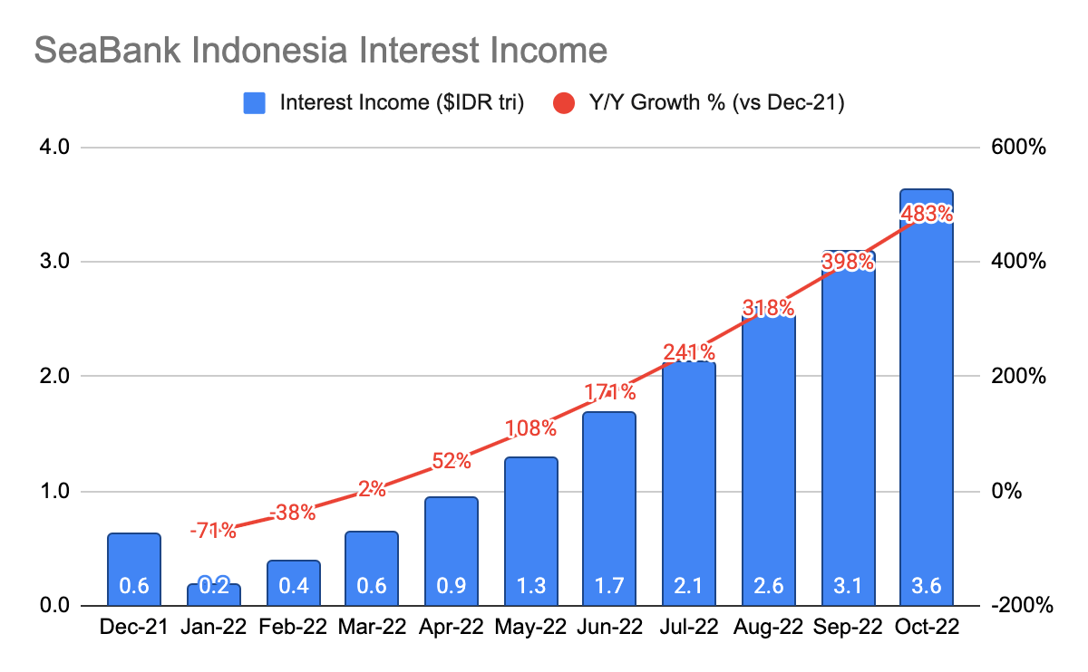 Driven by increasing loans and customer deposits, its interest income (aka revenue) grew 483% Y/Y to $IDR3.6 trillion while its net profit grew 107% Y/Y to $IDR$22 billion. Net profit margin expanded to 0.63% from 0.45% in Sep 2022.