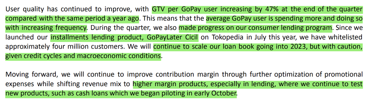 This shows how accretive the high-margin, lending business is, and the focus on self-sufficiency moving forward is going to place further emphasis on scaling its credit business. During GoTo's (IDX: GOTO) 3Q22 earnings, management is also placing emphasis on scaling its lending business, with the launch of its installment program in July 2022 and cash loans in early October.