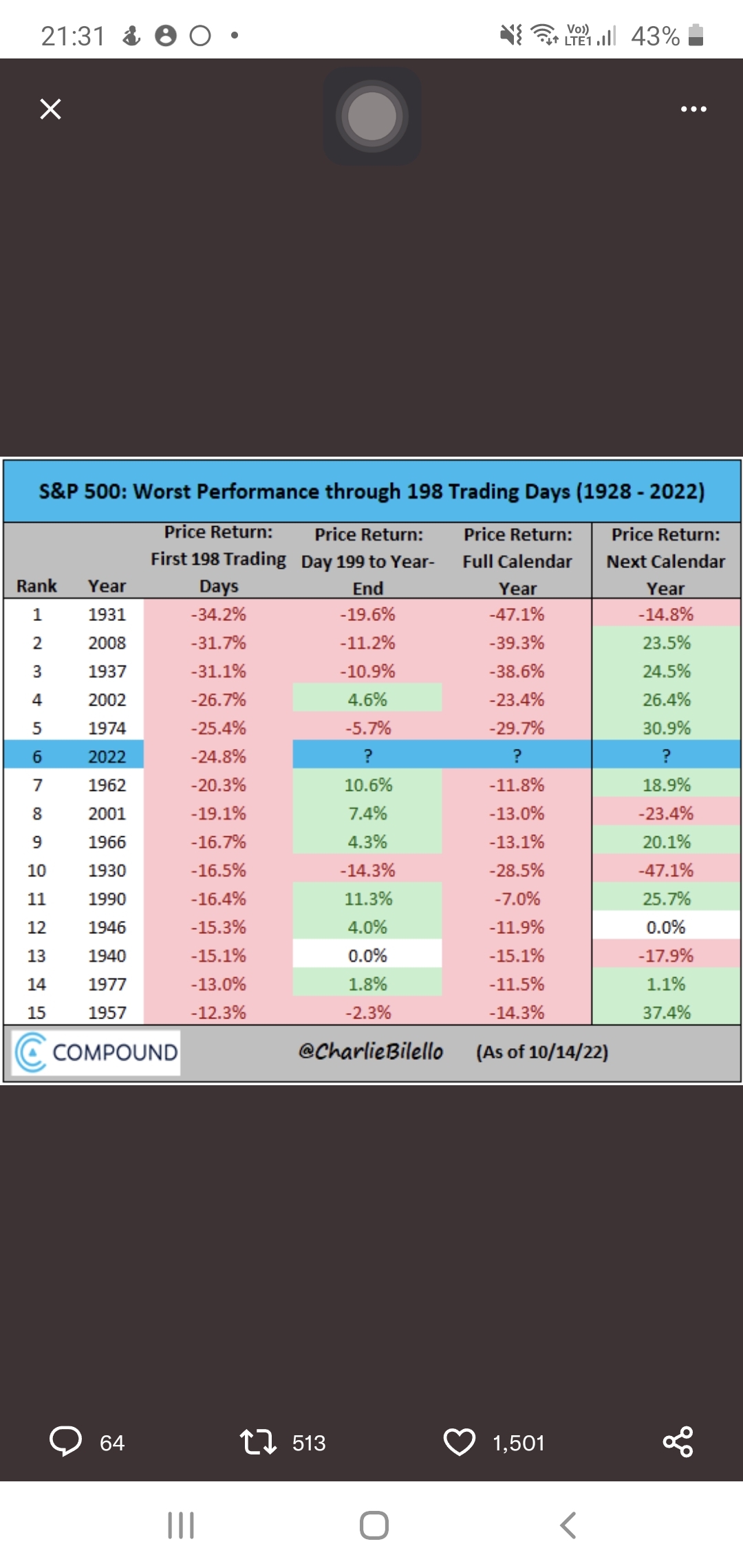 Bull case - so if we are assuming base on the thesis that S&P500 had bottomed, where could it be heading? According to Charlie Bilello (source I had obtained from Twitter), S&P returns on the next calendar year is generally bullish with the exception of 1931. Do note that 1931 happen to be part of the depression era so unless you think our world is coming to an end because of inflation or rate hike or because Jerome Powell wants to end capitalism 😂, it is remotely impossible 😉. By moving 1931 from consideration, the average return from 2008, 1937, 2002 and 1974 comes to 26.3%.