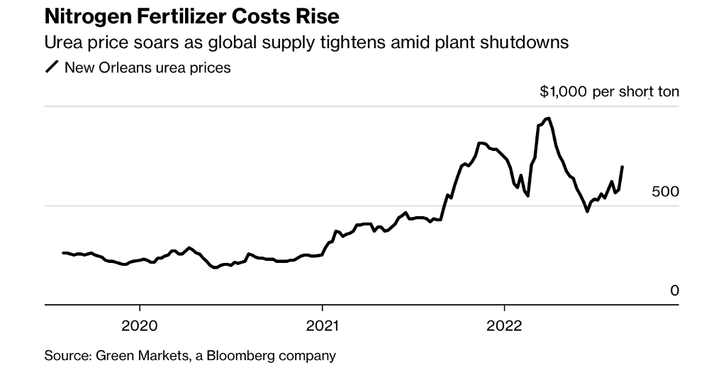 Post-war and sanctions, Urea prices reached record highs as Russia and Ukraine contributes around 15% of the total exports of Nitrogen, Phosphate and potassium (which are key ingredients for fertiliser production).