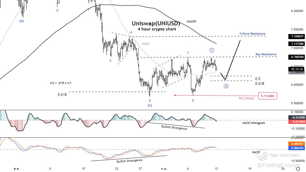 Uniswap (UNIUSD) Trading Strategy: Bul 's attempt to push prices higher A break through the key resistance level at MA200 line could be an opportunity to open a long position. But wait the price throwback in wave 2 and must not reverse below 5.716