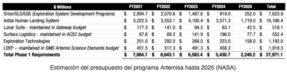 Well, according to what Daniel Marín tells us in his interesting and careful Blog Eureka, for about 28 billion dollars, spread over the space of five years. Of this amount, most corresponds to the lunar module — or, in NASA jargon, the HLS (Human Landing System) — , which will cost about 16.2 billion dollars. The Orion spacecraft and the SLS rocket will cost about $7.6 billion. Logically, this figure does not take into account the previous investment already made in the SLS and in the Orion spacecraft (NASA has already spent 18.6 billion dollars in the SLS and 16.7 billion in the Orion spacecraft). The asymmetric distribution of costs is logical if we take into account that the HLS is a critical element and that it has received practically no attention until 2020, that is, just four years before the scheduled date for the first moon landing.