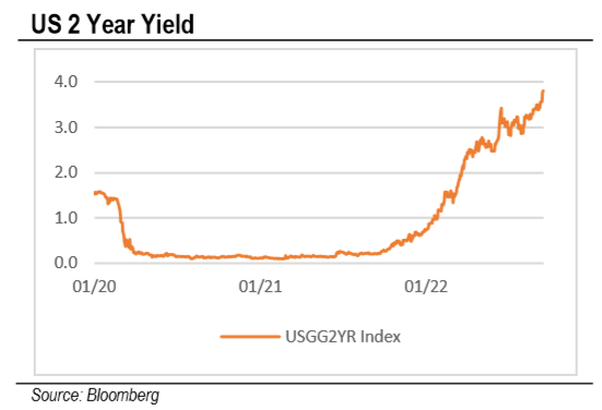 While it has already been widely expected that a 75bps rate hike was possible in the upcoming week, the market raised the probability of potentially an even tighter monetary condition. US short term 2-year yields surged to over 3.8%.