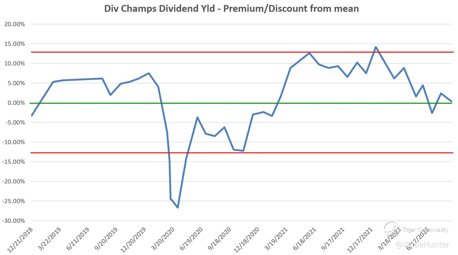 Without further ado, here is the chart. We have been tracking their performance ourselves over the years using charts like this (because of the reliability of their dividends, they also help us to get an overall feeling of the broader market condition). The chart shows the dividend yield of all the different champs (143 of them as of this month) in the past few years. More specifically, the chart shows the premium/discount of their yields relative to the historical mean.