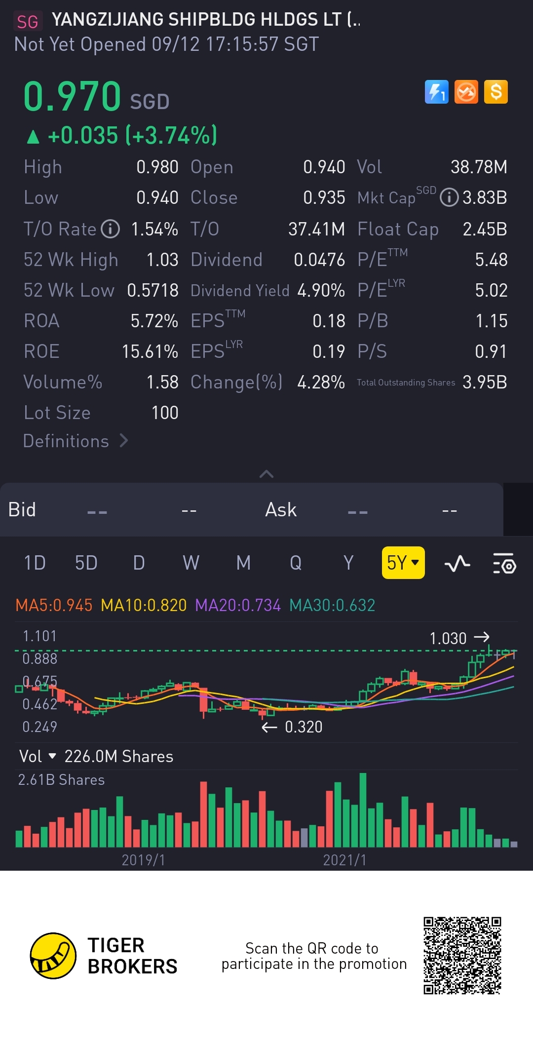 $YANGZIJIANG SHIPBLDG HLDGS LTD(BS6.SI)$ one of the better companies from China. Consistent profit and benefit from the recent shipping cycle