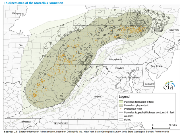 You all know me as a "rock-guy." That's where I look immediately when a company gives me information such as you see in the acreage footprint slide below.A look at the EIA thickness map of the Marcellus shows that a nice chunk of the SWN acreage is in the premium part of the play, with thicknesses in the 300-500' range. That said, the bulk of their 768K acre position is in the western portion of the play where thicknesses run more like 50'. Still pretty good, as the contours thin out rapidly the farther west you go. SWN notes they have 4,900 economic locations at $2.75 gas.
