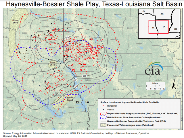 Looking at the Haynesville, the best stuff seems to be on the Louisiana side, and that's just where SWN's footprint seems to be. They show 1,700 economic locations at $2.75 gas, which should mean they have many more at $9.00 gas.