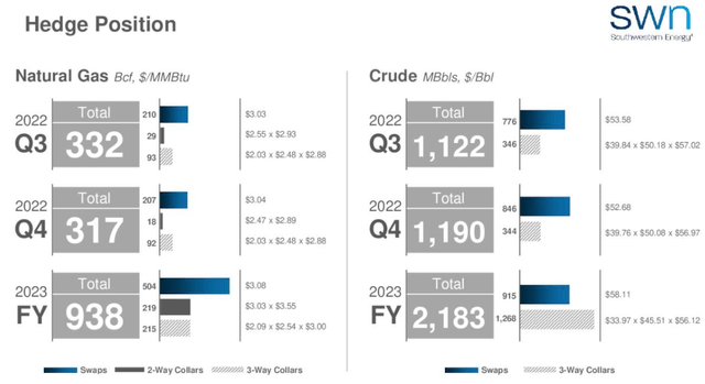 Hedging is problematic for SWN. They produce about 1.5 BCF/d of gas and have about 62% of that hedged at what I would call extremely low pricing. The upside here is that there is a plan to dial this back, starting next year, adding additional volumes to be exposed to market pricing.With our improved financial position, however, and the supportive fundamental outlook for natural gas prices, expect our future hedging levels to migrate lower within our approved ranges and with preference for using collars. As our hedges settle, our reinvestment rate will more clearly reflect the inherent cash generation capability of our asset base. The resulting prospective rate of change in our free cash flow profile differentiates SWN as an investment opportunity.