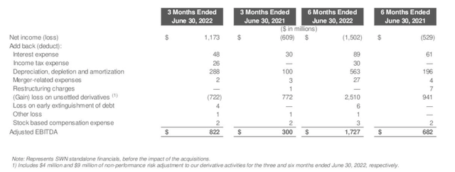 This quarter beat expectations, on revenues of $4,140 bn on which SWN generated approximately $1.5 bn of EBITDA and $170 million of free cash flow. A working capital draw caused by the sharp rise in natural gas prices between April and June, and settlement of hedges, cut into their OCF for the quarter.