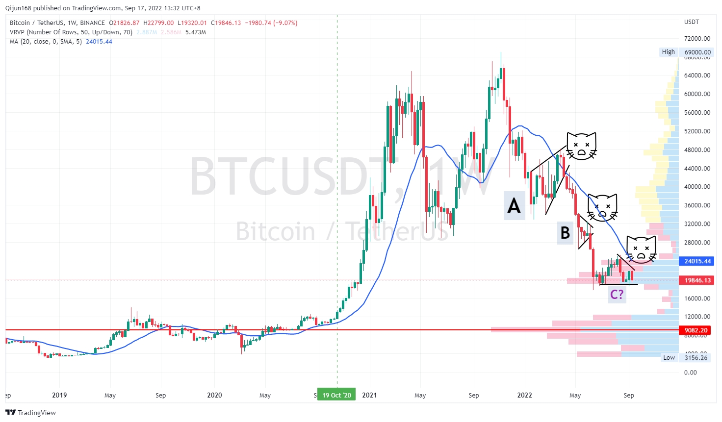 As of now, it looks like another dead cat bounce is on the way, smashing below 19000 would bring it down back to 12500pt, a level not seen since Oct 2020