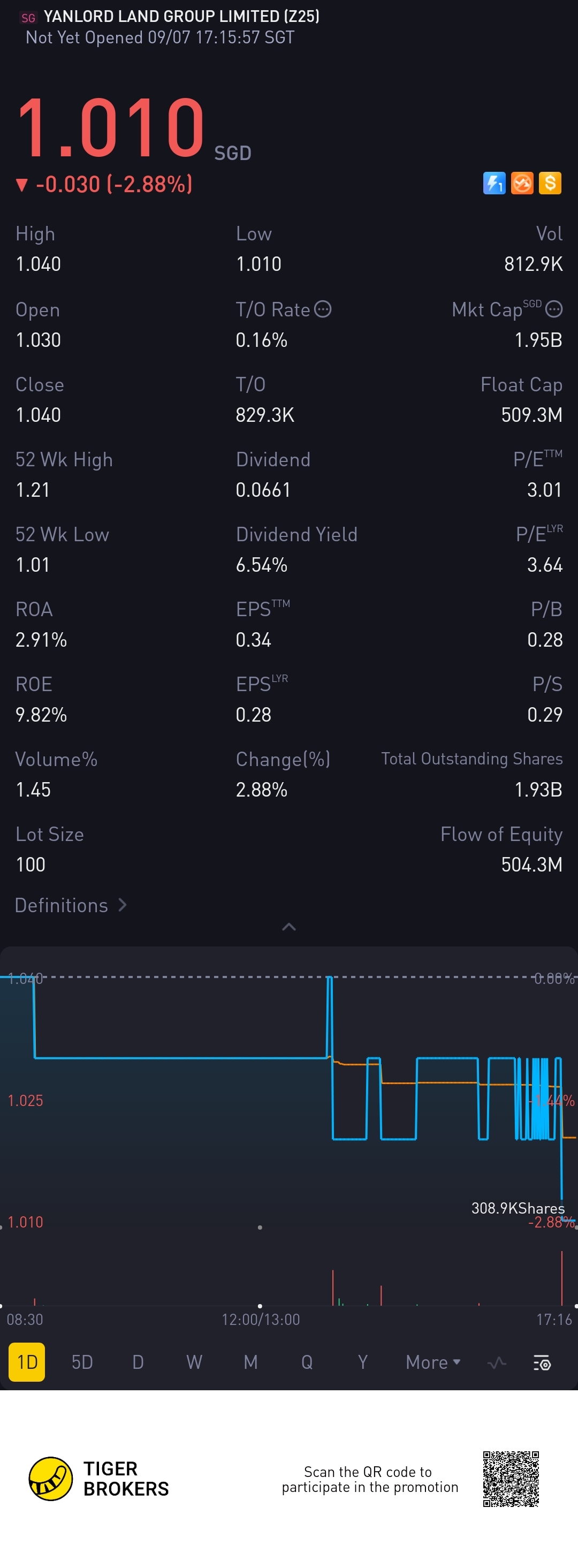 $YANLORD LAND GROUP LIMITED(Z25.SI)$52 week low at 1.01, yield at 6%. Exposure to China property market [Doubt]