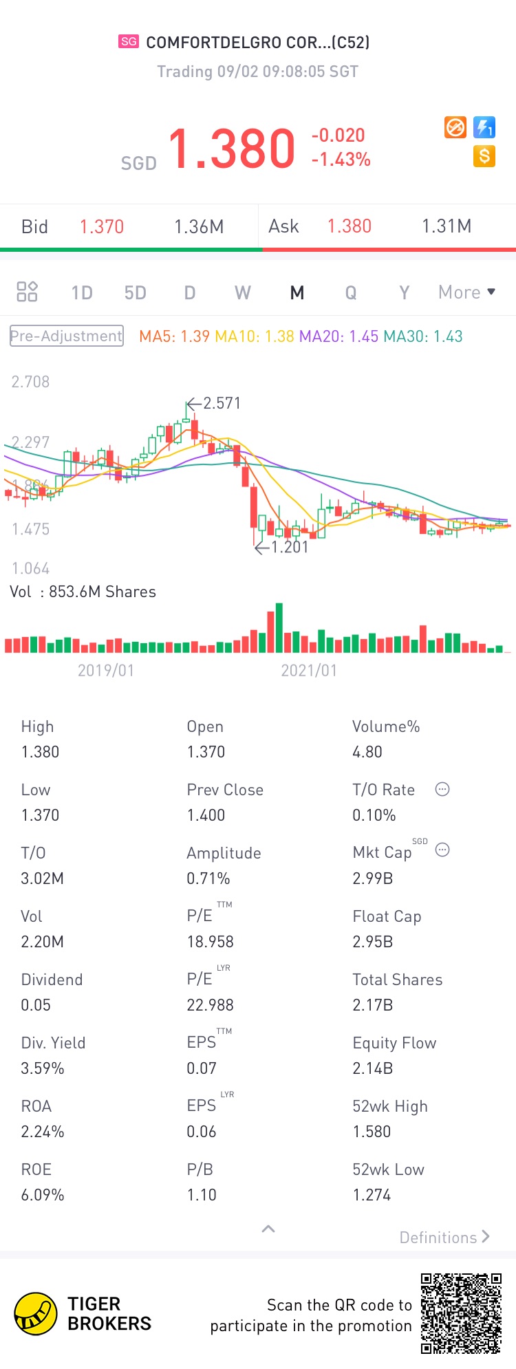 $COMFORTDELGRO CORPORATION LTD(C52.SI)$is an investment holding company, provides public transport services in Singapore. It operates through 7 segments: Public Transport Services, Taxi, Automotive Engineering Services, Inspection and Testing Services, Driving Centre, Car Rental and Leasing, and Bus Station. The company offers bus and rail services to commuters; taxi and coach rental, and related advertisement services; non-emergency transport services to patients; vehicular maintenance and repair services; assembly of bus bodies; crash repair services; and engineering services, as well as sells diesel and petrol. It is also involved in the provision of motor vehicle inspection, non-vehicle testing, inspection, and consultancy services; construction of specialized vehicles; operation of taxi bureau, scheduled services, and driving schools; electric vehicle charging infrastructure activities; and renting and leasing of cars. In addition, the company offers public taxi and charter bus, management of taxi booking, building inspection, technology, and terminal services; and operates workshops for repairing, servicing, and general maintenance of motor vehicles. Further, it provides insurance broking, risk management, claims management, and related services; medical escort services; charge card facilities; and accident and other repair and maintenance services. As of March 30, 2022, the company operated a fleet of 35,000 buses, taxis, and rental vehicles. It also operates in the United Kingdom, Ireland, Australia, China, New Zealand, and Malaysia. ComfortDelGro Corporation Limited was incorporated in 2003 and is headquartered in Singapore.
