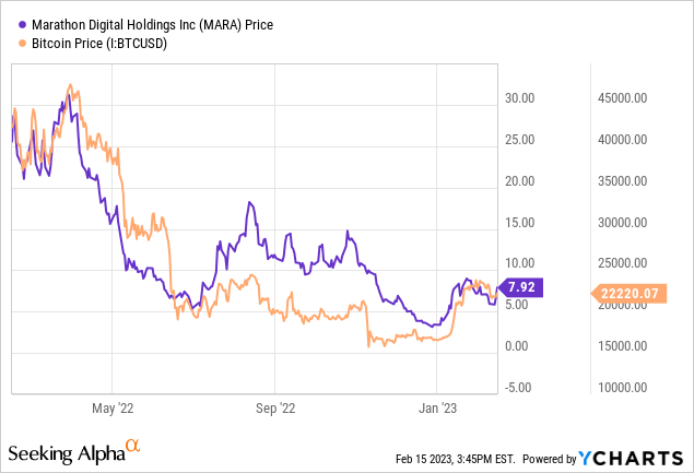 But Bitcoin has acted proportional to inflation over the last year with the asset dropping when a flight of capital away from stocks and bonds to crypto was meant to take place to reflect the dominant crypto narrative. That this didn't happen significantly limits the use case for Bitcoin and its relevant investment proxies like Marathon in my opinion. It adds legs to bearish arguments that Bitcoin is mainly a speculative asset whose previously insatiable animal spirits now look to be returning on the back of an end to the current Fed rate hike cycle.