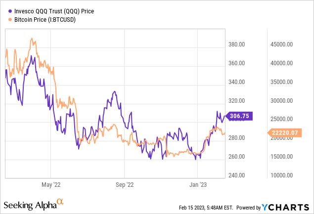 Marathon acts as a proxy for a direct Bitcoin investment and has been buoyed by the enthusiasm building around a near-term end to rising Fed funds rate. It's likely there will be two further 25 basis point hikes to close out its chapter. Marathon tracks Bitcoin which in turn moves in parallel with the tech-heavy Nasdaq 100 index (QQQ).