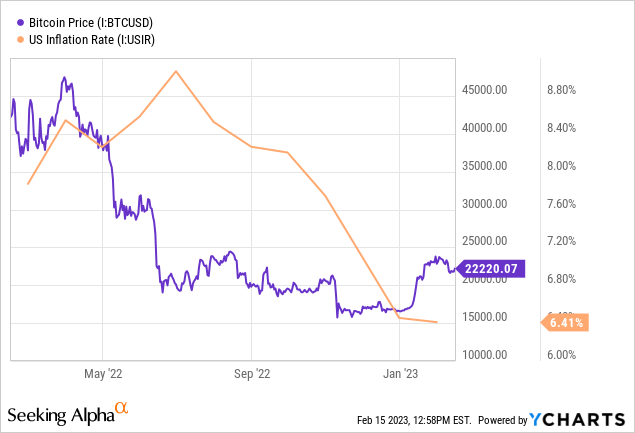 To be clear, Marathon's recent outperformance has not been built on an improvement in the underlying fundamentals of the cryptocurrency but on broader macroeconomic conditions that have placed the company on the same path as more traditional tech stocks. Why do I think this is concerning? A pertinent argument put out by Bitcoin maximalists was that the digital asset presents a hard break away from financial orthodoxy and a hedge against inflation.