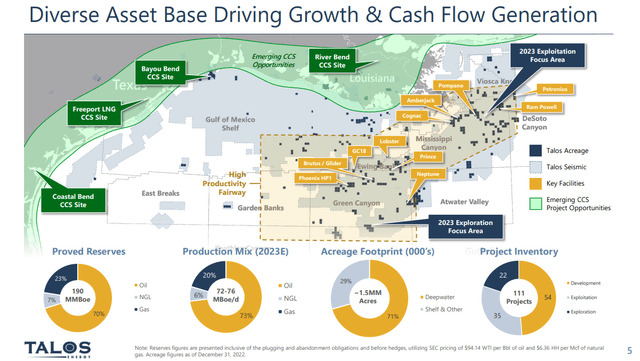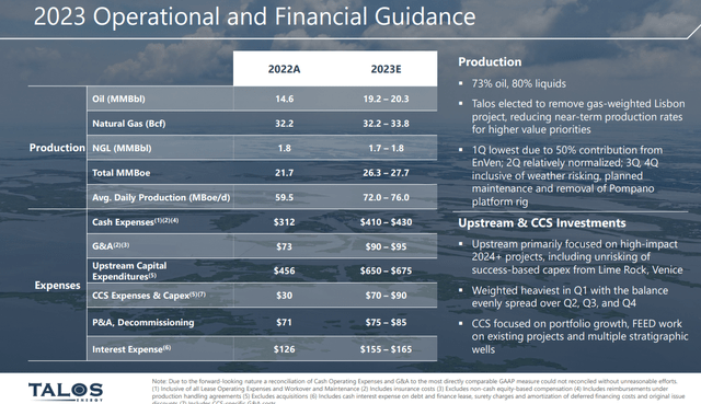 In 2022 total production was 59.5K BOEPD and management is guiding toward total output of 72-76K per day. They are also increasing the oil output. As you can see from the slide below, Talos has shifted their production targets to substantially increase oil output. This is after a bruising 2022 where over half their total was gas weighted.