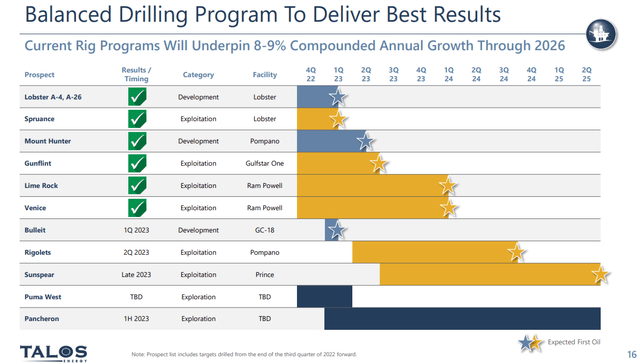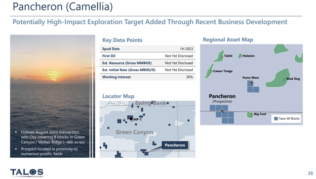 I think the key point here in the quote above is the "geological fairway." It lies just west of theChevron Big Footwhich targeted 200 mm bbl, and nearby CVX, Shell and BP projects (Tahiti, Holstein, and Mad Dog that have collectively produced a couple of billion barrels over the last two decades. It's a fair point this is a target-rich environment, and Talos is justified in having high expectations. Pancheron is scheduled to be drilled in the first half of 2023.