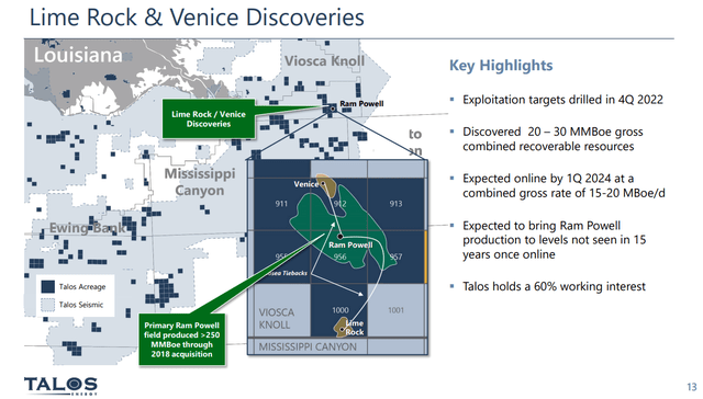 These "pockets" of oil left behind in the Super Major exodus from shallow-deep to mid-deep water, plus the new fields that are identified in today's ultra high tech seismic imaging make a veritable feast for an operator like Talos Energy. Q-4, 2022's Lime Rock and Venice discoveries are examples quick turnaround adds of oil weighted production, facilitated by the Ram Powell TLP-Tension Leg Platform. The two wells are expected to contribute up to 20K BOEPD of mostly oil.
