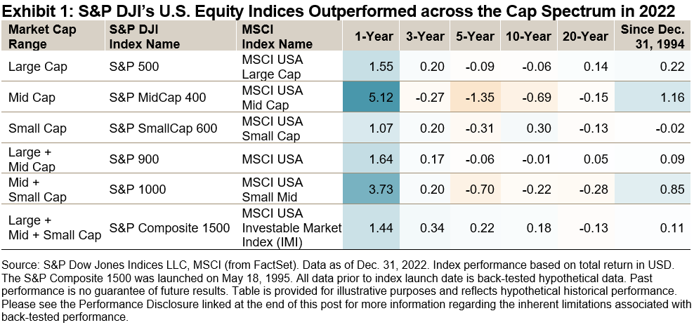 Exhibit 1 highlights that the S&P Composite 1500®’s outperformance was both consistent and widespread in 2022, with $S&P 500(.SPX)$ $DJIA(.DJI)$ U.S. Core Indices outperforming MSCI ACWI USA Indexes across all market capitalization segments on average for three out of every four months in 2022. Theoutperformance ranged from 1% to 5%,with mid caps hosting the biggest performance differential—theS&P MidCap 400®beat the MSCI USA Mid Cap by 5%, its largest calendar year margin since 2016. Since Dec. 31, 1994, S&P DJI U.S. Core Indices beat MSCI ACWI Index in most cap-ranges.