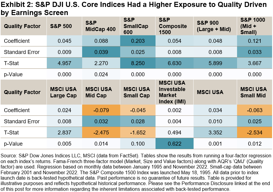 Differences in index construction have meant that S&P DJI indices have historically had a higher exposure to the quality factor than their MSCI counterparts. For example,the S&P Composite 1500 requires, among other criteria, potential new index additions to have four consecutive quarters of positive earnings to be considered for eligibility. The MSCI ACWI USA Indexes have no such requirements. This difference helps to explain why S&P DJI indices have a significant exposure to the quality factor, as shown in Exhibit 2.