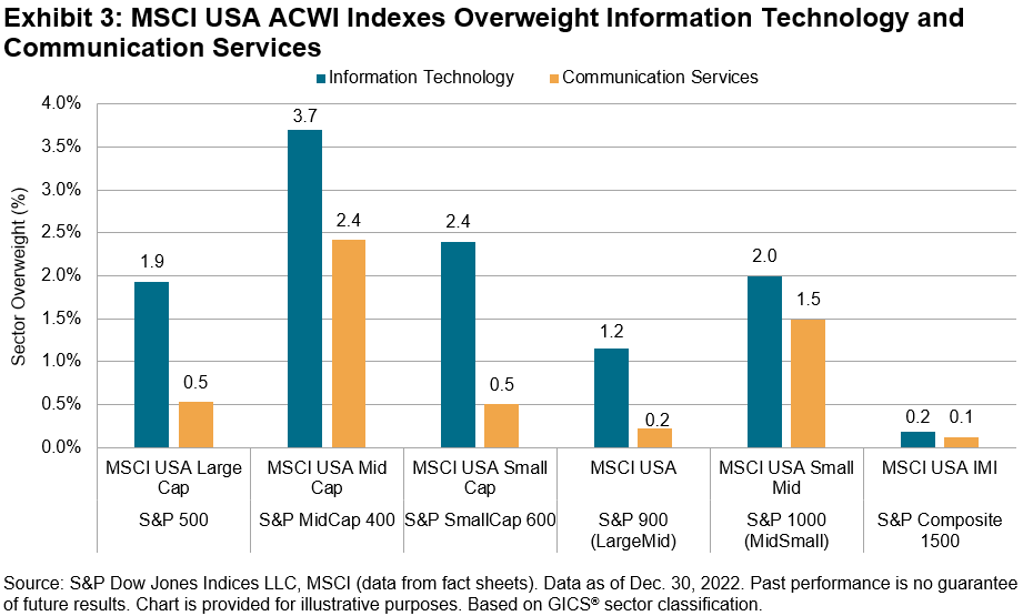 Sectors were also a major driver of performance in 2022,as the spread between best- and worst-performing sectors in the $S&P 500(.SPX)$ closed the year at 106%.The S&P 500 and S&P MidCap 400 both had a lower sector weight to Communication Services and Information Technology than their MSCI counterparts, explaining part of the recent outperformance given thematerial underperformance of technology-related sectors. The S&P 500 and MSCI USA Large Cap had a 26% and 28% weight to Information Technology, respectively. While I.T.’s mid-cap sector weight is about half of its large-cap weight, the spread in its weighting between benchmarks can vary more, with the MSCI USA Mid Cap having a 4% overweight versus the S&P MidCap 400, as shown in Exhibit 3.