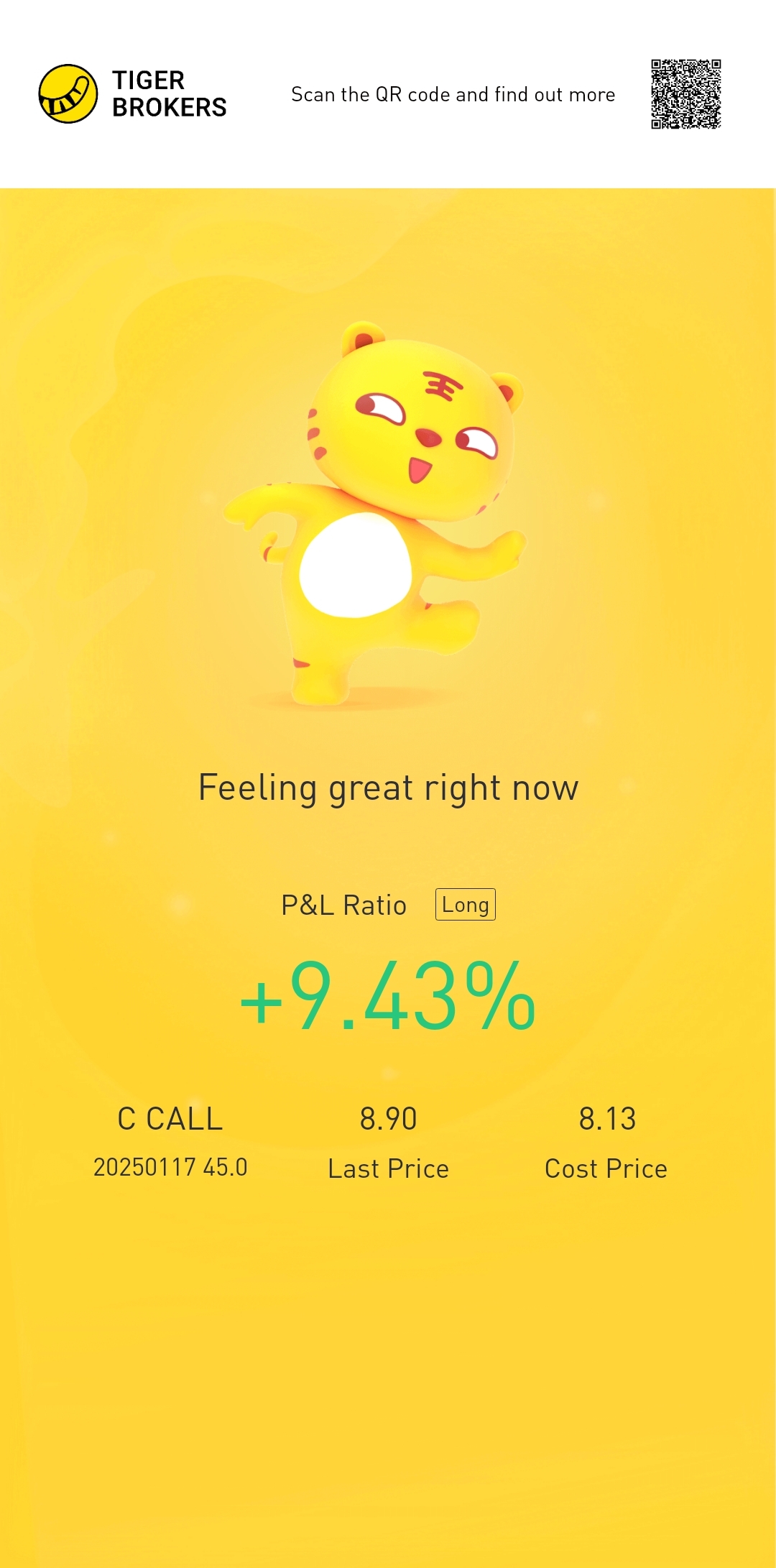 $C 20250117 45.0 CALL$ Be greedy when everyone are fearful. Be prudent when everyone are greedy. Never buy anything blindly because it is hotnews. If you have done your FA and TA. Hoot & Loot[Miser] [Cool] [Allin] [Call] [Call] [Call] [Heart]