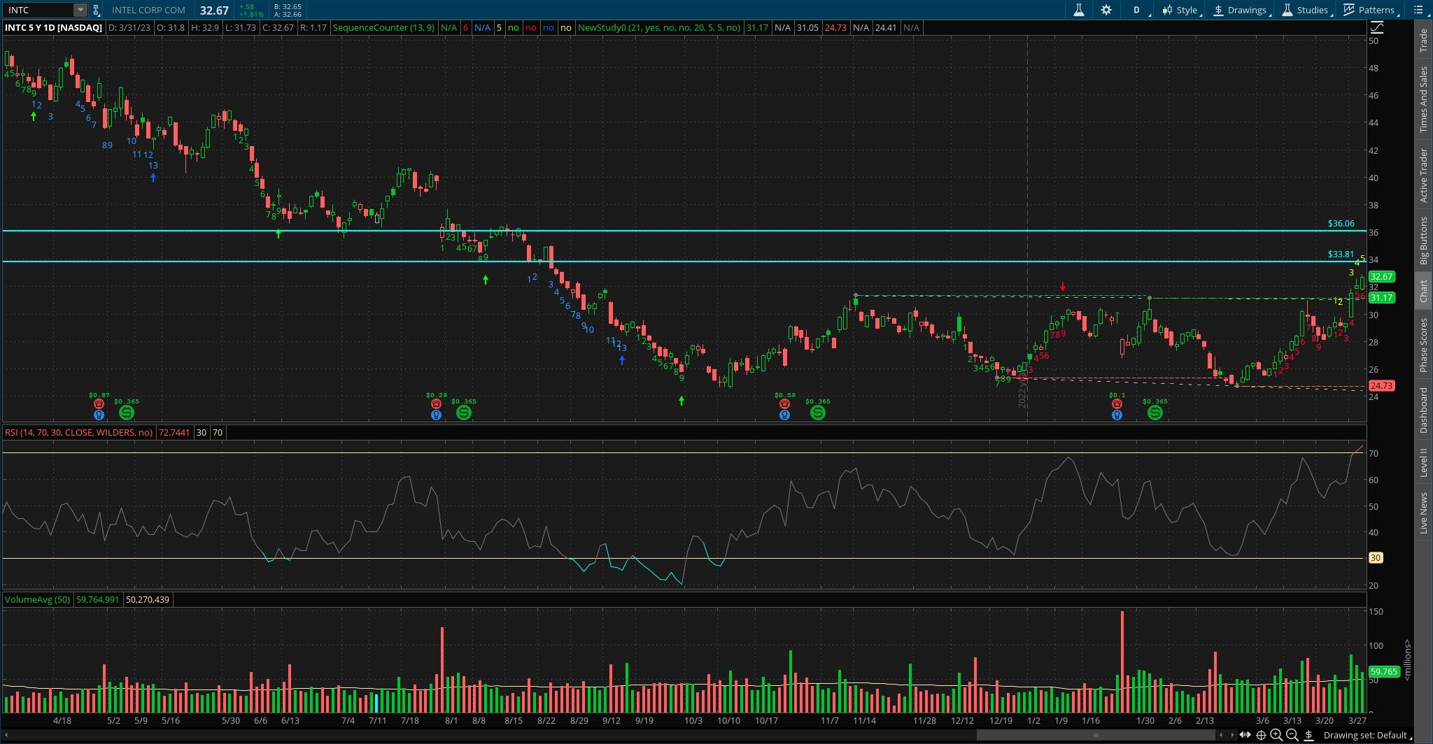 When the TD9 count of Intel reached 9 with a perfect sell formed this coming Wednesday, I will consider buying some put options at the strike price of 36 even if the Put Option is OTM. Of all the semiconductor stocks that surge in recent months with the AI hype, Intel is probably the least popular amongst them. So, I expecting INTC to drift lower with the broader market compared to other stocks like NVIDIA.