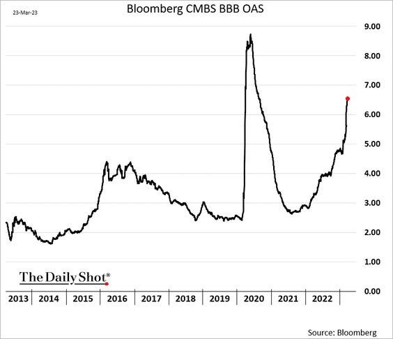 The markets are pricing in an imminent default for the CMBS as the price action here is getting really scary. The OAS (Option adjusted spreads) on CMBS have started to blow up.