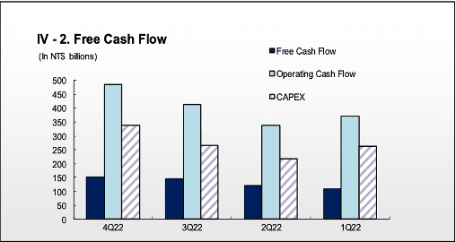 TSM generated $17.4 billion in free cash flow in FY22, doubling FY21. We do expect revenues and EPS to decline slightly in FY23 due to normalizing semiconductor market conditions. However, as TSM expands its offerings and manufacturing base, we expect it to solid recover and a return to secular growth. Even at this level of spending, TSM expects to sustain its modest dividend which pays a 2.0% yield.