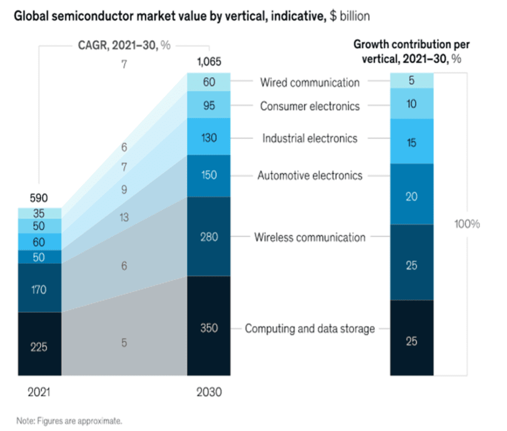 However, over the decade the CAGR is expected to be 12.2% with sales surging to $1.38 trillion in market size by 2030. For reference, the last 50 years of demand for semiconductors will be added in only 10 years even by conservative estimates.