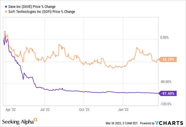 Dave currently sports a $71 million market cap, 7.5x smaller than SoFi's $5.36 billion market cap. The Mark Cuban-backed neobank went public at a$4 billionvaluation versus the go-public valuation of$8.7 billionfor SoFi. Hence, the performance dichotomy between both fintechs has been stark with the gap between both being extended on the back of a dearth of cheap liquidity sparked by a hawkish Fed.
