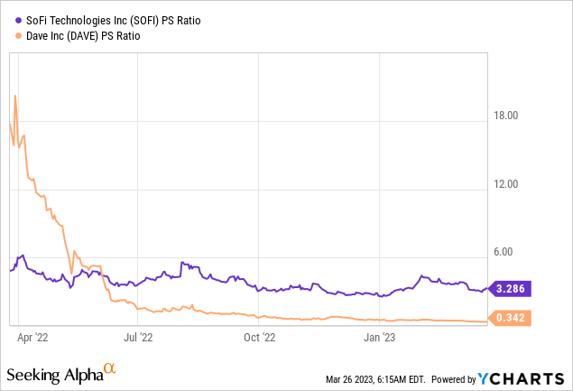 Crucially, the gap between both is exacerbated by a 10x difference in their price-to-sales multiple. To be clear here, if Dave's trailing 12-month PS ratio at 0.34x was to change to SoFi's 3.28x multiple, it would trade on a roughly $700 million market cap. But why should both companies trade on the same valuation? This is dictated by sentiment and SoFi is a fundamentally safer and more diversified entity with a product flywheel that has positioned it well for what could soon stand to be profitable growth.