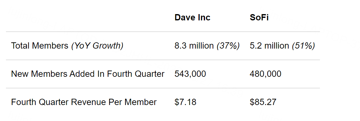 - Both offer checking accounts but SoFi offers materially more financial products. This drove an 11.9x difference in revenue per member versus Dave for the fourth quarter.