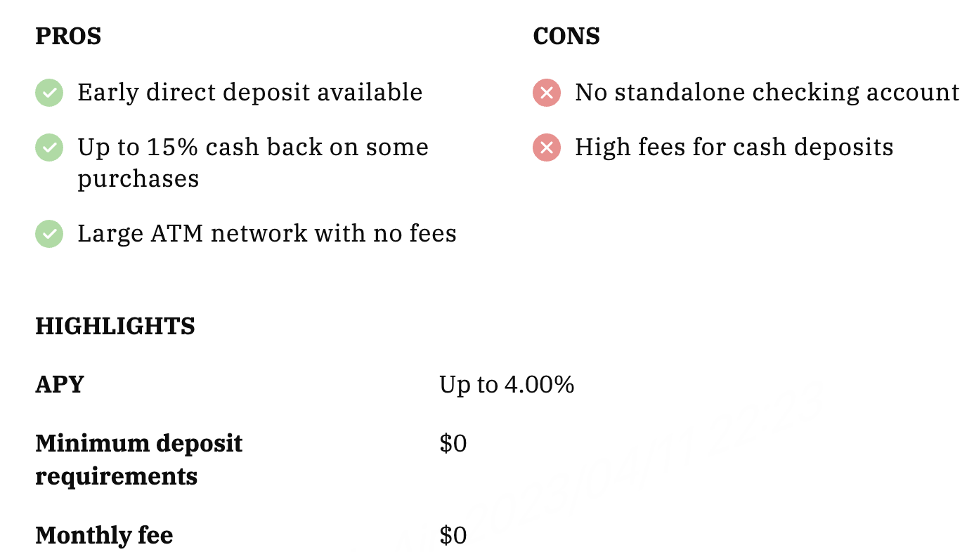 SoFi Checking and Savings keeps two separate balances in one account. Your checking balance can earn up to 1.20% APY and your savings balance can earn up to 4.00% APY. To earn the highest possible APY, you’ll have to set up direct deposit. SoFi can expedite deposits up to two days before the usual date, so this account is definitely best for someone who gets paid through direct deposit. If you do not set up direct deposit, you will earn 1.20% APY on both accounts. It also offers up to 15% cash back on limited local purchases.
