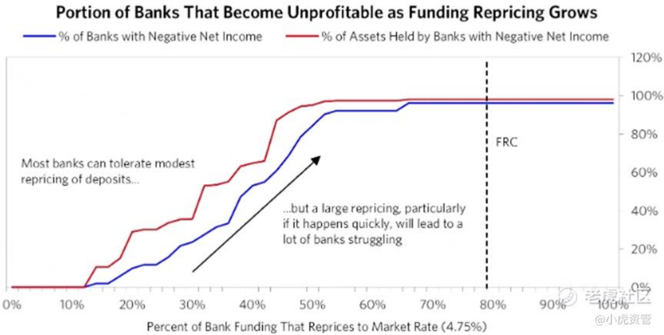 According to Bridgewater's estimate, if only 10% to 20% of bank's deposits on the liability side are replaced with short-term financing at a market rate of 4.75%, the proportion of banks with negative net profit and negative interest margin assets will increase significantly. As shown in the figure below, 80% of First Republic Bank's deposits have already been replaced with financing at market rates.